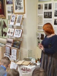 Встречу провела директор музея Елена Ивановна Советникова. Она показала учащимся неизвестную сторону биографии великого мастера пера, рассказывая о его скромной медицинской карьере, начавшейся в провинциальных больницах. Школьникам были представлены редкие экспонаты того периода: старинные стеклянные шприцы, медицинские инструменты, бутылочки из под лекарств и многое другое.